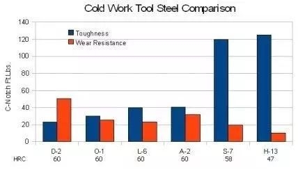 从硬度、耐磨及韧性三个指标(见下图)来看,S7的性能介于A2和H13之间,可弥补此二者之不足。