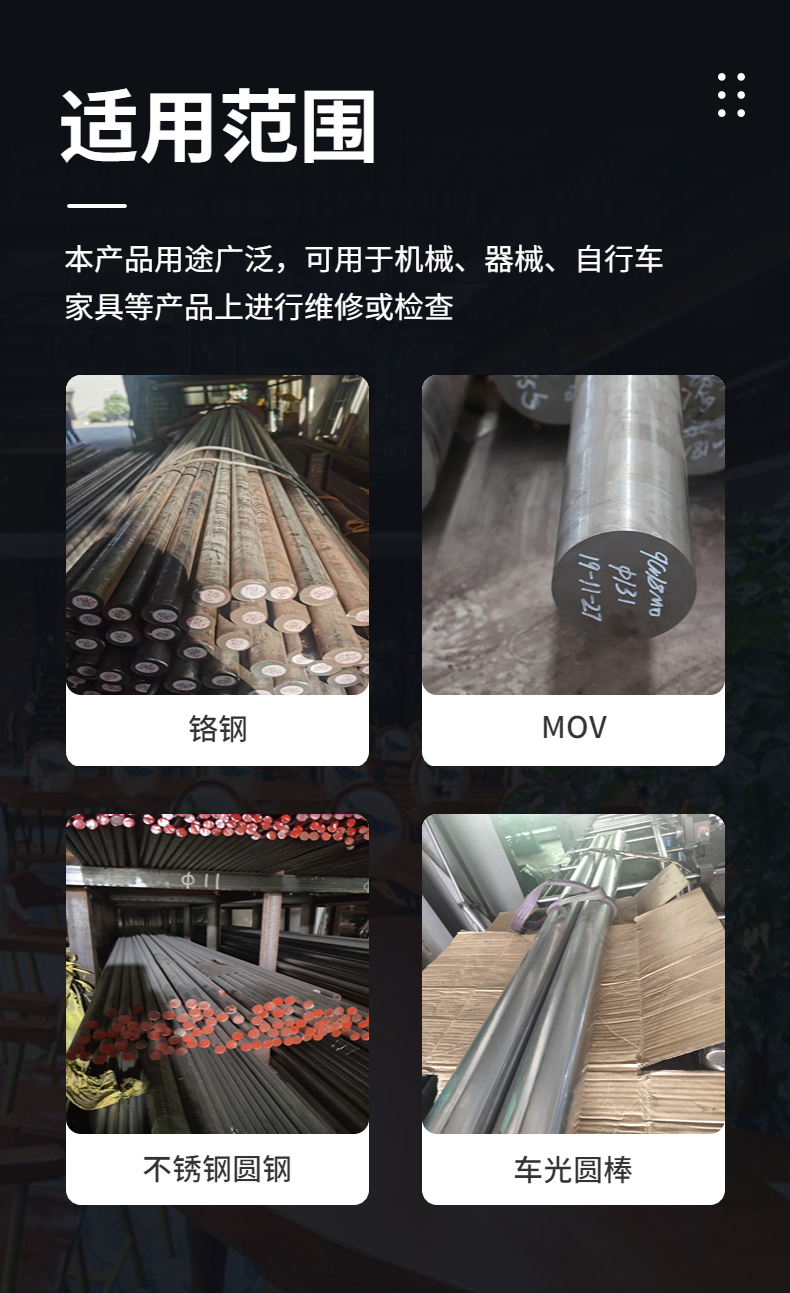 产品材质;普碳钢,优碳钢,合金钢,轴承钢等产品,广泛用于纺织机械行业,缝纫机制造业,农业机械制造业,起重机械制造业,电机业,转动系统业,锚具业,机械制造业(机床制造,水电设备制造,木工机械制造)标准件机械制造等行业。