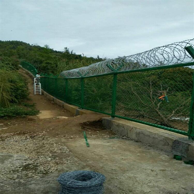 边境线铁丝网以钢材焊接后再做浸塑处理后。采用高科技防腐处理工艺,在钢体表面浸涂一层附着力非常强的热性工程塑料保护层,使钢体与空气、水分及酸碱物质隔离,达到耐磨、抗紫外线强,不被腐蚀、不生锈的效果。其外观饱满亮泽,色彩多样,边境线铁丝网使用寿命长不需上漆维护的显着优点其产品具有造型美观、花色多样,既起到围栏作用,又起到美化作用。