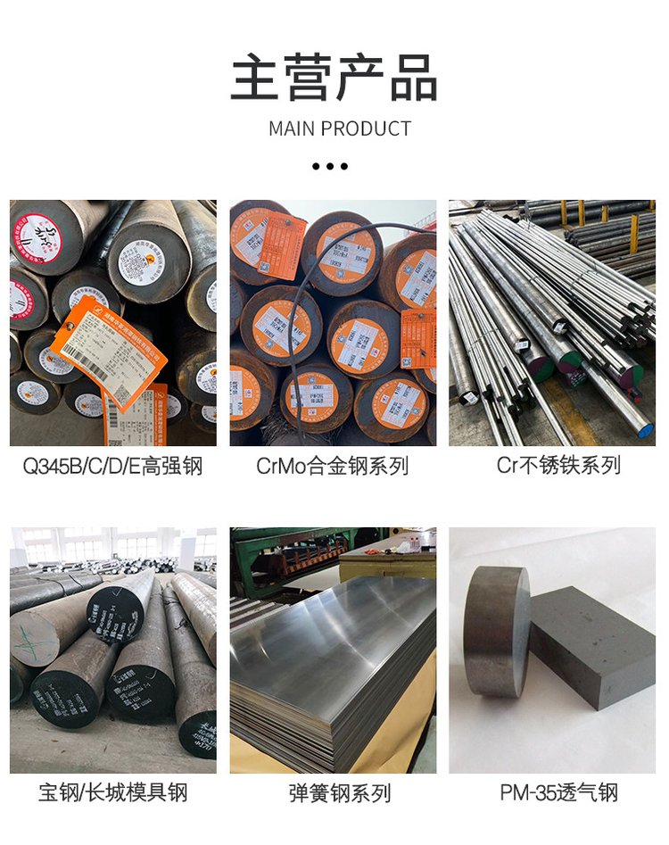 主要经营:进口模具钢、军工钢、合金钢、易切削钢、弹簧钢、轴承钢、高速钢、齿轮钢、不锈钢、无磁钢、耐磨钢、钨钢,代理销售:日本日立,日本大同,瑞典一胜百,奥地利百禄,美国芬可乐,德国撒斯特等世界著名钢厂优质塑胶模具钢,冷作模具钢,热作模具钢。