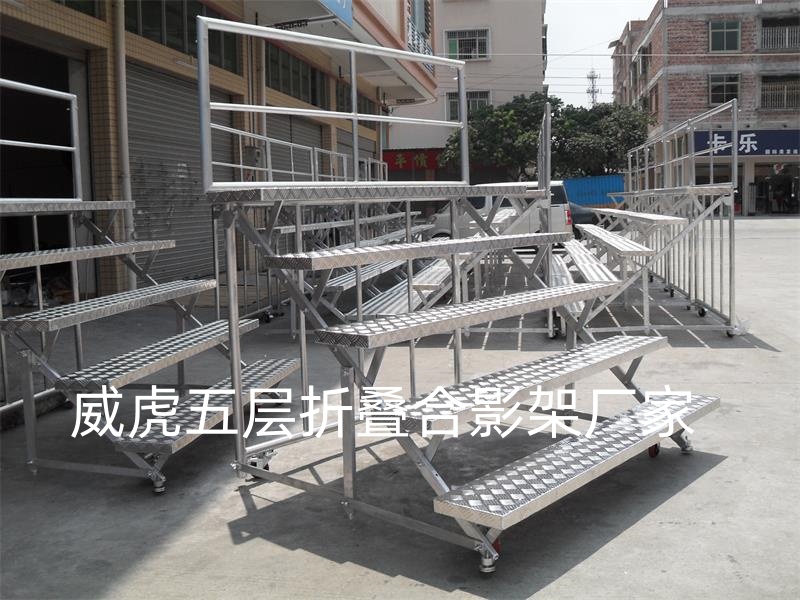 威虎舞台专业生产铝合金折叠合唱台,合唱台多用于人多,集合度较高的场合,例如,合唱,合影等。踏步可木板加地毯.贴面木板加包边.铝合金板面,踏步有三层.四层.五层.六层可选,有带脚轮和不带脚轮。单个基本宽度1.2米、1.5米、1.6米,1.8米,单个最宽为2米,可以多个组合。长宽高可根据客户的需求来订做,需要多少层就可做多少层,结构牢固,价格适中,外观精美,深受消费者的认同。折叠式合唱台架,轻便牢固,台面为铝合金板面(防滑), 台支撑铝合金结构,带脚轮方便移动,台阶底部加装防磨固垫,保护台阶的同时增加安全系数。配件大量采用低碳钢精密铸造件与合金钢热处理件。受力螺栓均为高强度合金螺栓。合唱台的靠栏可拆装.踏步可折叠起来,节省90%空间,易存储,运输方便。广泛用于学校、单位、文艺演出、集体照相、少年宫、各大企业事业单位。