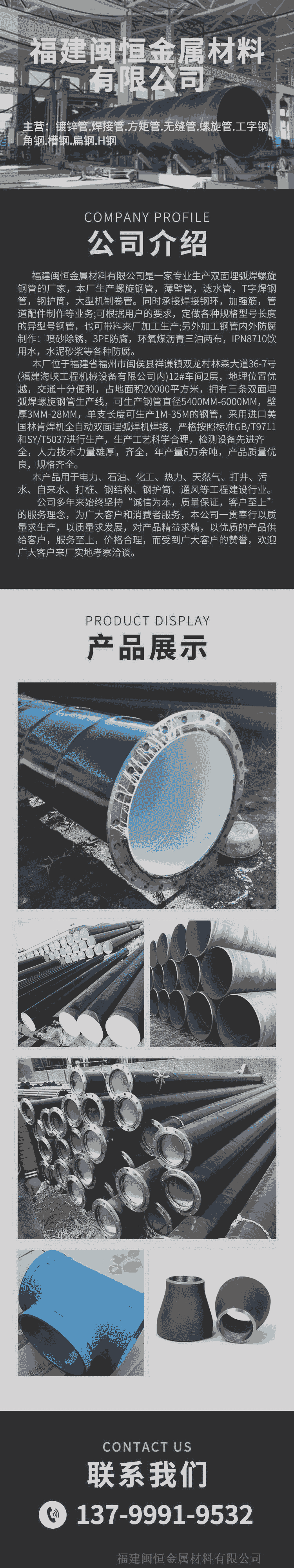 是一家专业生产双面埋弧焊螺旋钢管的厂家,本厂生产螺旋钢管,薄壁管,滤水管,T字焊钢管,钢护筒,大型机制卷管。同时承接焊接钢环,加强筋,管道配件制作等业务;可根据用户的要求,定做各种规格型号长度的异型号钢管,也可带料来厂加工生产;另外加工钢管内外防腐制作:喷砂除锈,3pe防腐,环氧煤沥青三油两布, IPN8710饮用水,水泥砂浆等各种防腐。   本厂位于福建省福州市闽侯县祥谦镇双龙村林森大道36-7号(福建海峡工程机械设备有限公司内)12#车间2层,地理位置优越,交通十分便利,占地面积20000平方米,拥有三条双面埋弧焊螺旋钢管生产线,可生产钢管直径5400mm-6000mm, 壁厚3mm-28mm,单支长度可生产1m-35m的钢管,采用进口美国林肯焊机全自动双面埋弧焊机焊接,严格按照标准GB/T9711和SY/T5037进行生产,生产工艺科学合理,检测设备先进齐全,人力技术力量雄厚,齐全,年产量6万余吨,产品质量优良,规格齐全。   本产品用于电力、石油、化工、热力、天然气、打井、污水、自来水、打桩、钢结构、钢护筒、通风等工程建设行业。  公司多年来始终坚持“诚信为本,质量保证,客户至上”的服务理念,为广大客户和消费者服务,本公司一贯奉行以质量求生产,以质量求发展,对产品精益求精,以优质的产品供给客户,服务至上,价格合理,而受到广大客户的赞誉,欢迎广大客户来厂实地考察洽谈。联系电话:13799919532