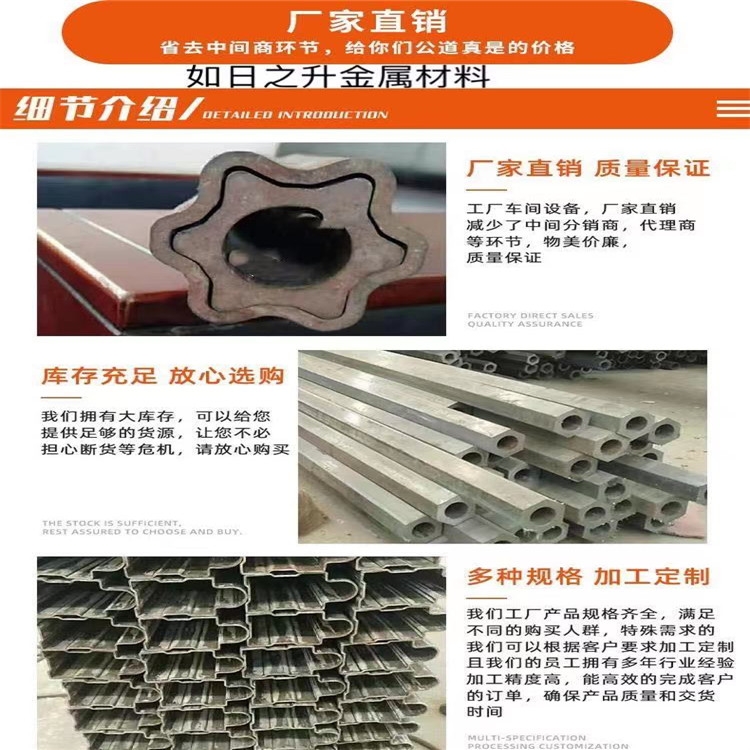 专业生产  ;椭圆管、面包管、梅花管、三角钢管、六角钢管、八角钢管、内圆外六角无缝钢管等多边形不规则异型钢管,可来图纸定做,根据客户的需求加工异型钢管,填补了国内对异型钢管的需求空白。