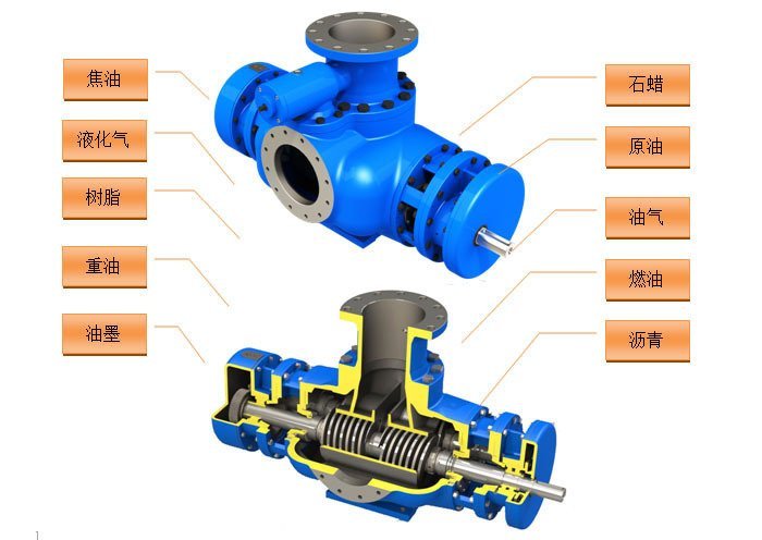 双螺杆泵有密封式和不密封式两种类型,按介质从一端还是 从两端进入啮合空间,双螺杆又被分为双吸式和单吸式两种结构。双螺杆泵是外啮合的螺杆泵,它利用相互啮合,互不接触的两根螺杆来抽送液体。双螺杆泵为一种双吸式非密闭的双螺杆泵。一端伸出泵外的主动螺杆由原动机驱动。主动螺杆与从动螺杆具有不同旋向的螺纹。螺杆与泵体紧密贴合。从动螺杆是通过同步齿轮由主动螺杆带动的。