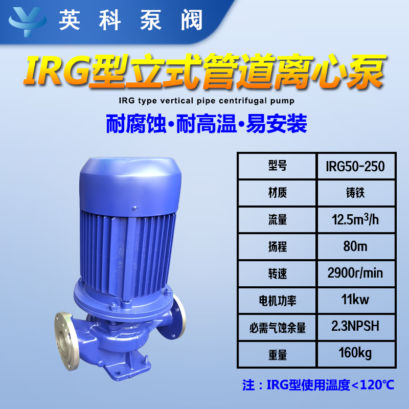 立式管道离心泵IRG50-250热水管道泵11KW单级铸铁12.5m3/h英科牌 泵轴位置 | 立式 | ||