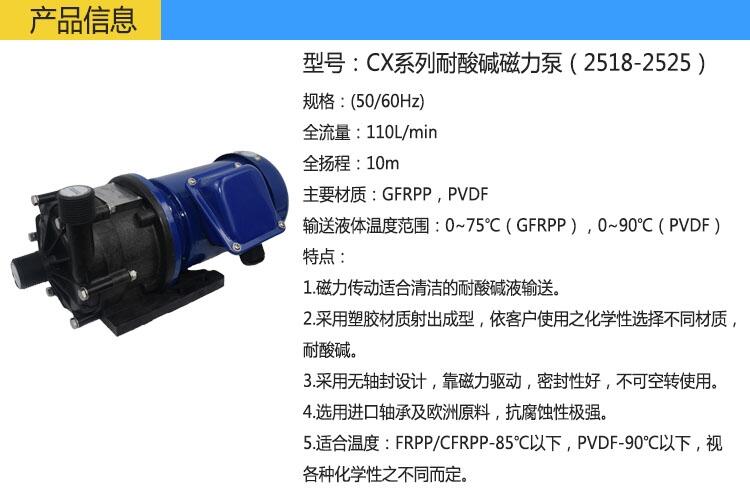 产品规格:(50/60Hz) 电机功率:70-250 W 全流量:45-110 L/min 全扬程:3.5-10 m 主要材质:FRPP,PVDF 适合温度:0~75℃(FRPP),0~90℃(PVDF)