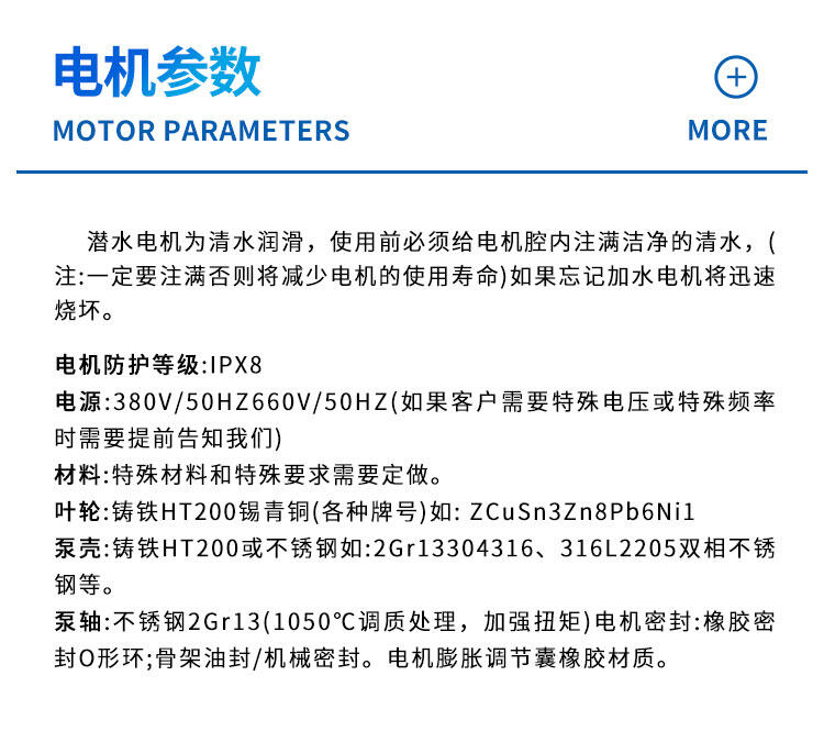 潜水电机为清水润滑,使用前必须给电机腔内注满洁净的清水,(注:一定要注满否则将减少电机的使用寿命)如果忘记加水电机将迅速烧坏。