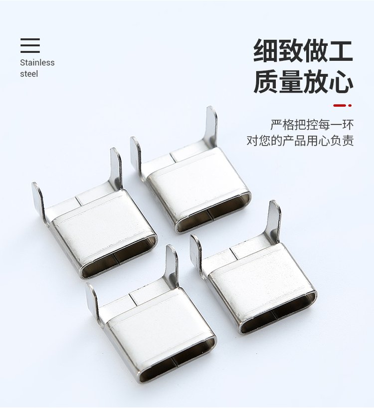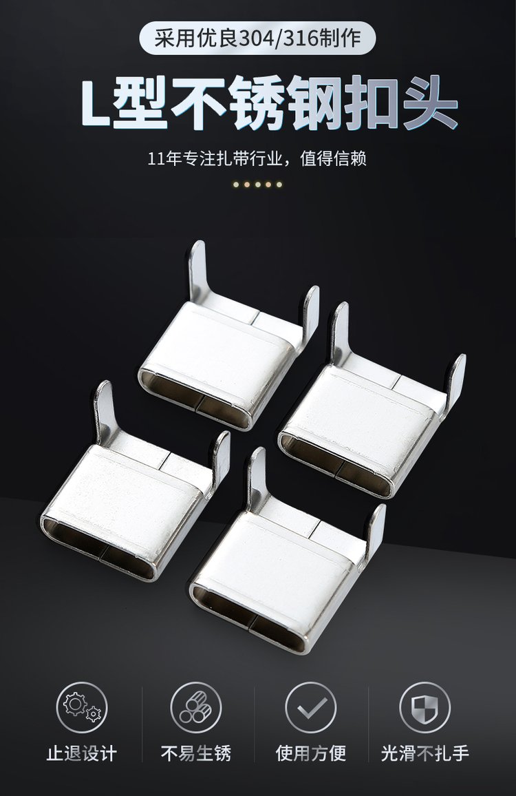 不锈钢扎扣,又称为不锈钢打包扣或不锈钢捆绑扣,用于配合不锈钢扎带来对绑扎物体进行捆绑固定。而L型不锈钢扎扣为经济型捆扎扣,捆扎标牌,电缆,管道保温等,用于舶业,矿业,石油业,化工管道行业以及建设等等。