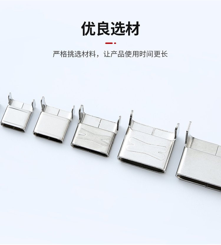 2.具有各种规格类型扎扣可选(6.4?9.5,12.7,15.9,19.0,25,30mm),配合宽度为6-35MM不锈钢带,能适应各种形状工程任务的被捆扎物体;