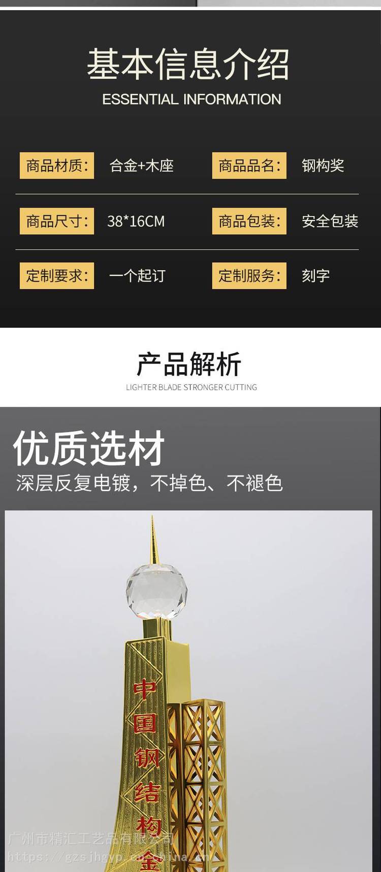 本公司主要生产:金属制品,合金奖杯、小金人奖杯,企业形象奖杯、工艺品,高/档商务礼品,纪念品,奖杯,奖牌,盾牌等相关产品。精汇工艺所有产品都采用高/档材料,从原料到生产及出货过程经过严格的检测,确保为客户提供了有保证、放心的优/质产品!凭借在礼品行业丰富的经验,我们的产品不但在式样上标新立异,在质量上更是一丝不苟、精益求精,在价格上更是实/惠,有着良好的售后服务。作为一家专/业设计、生产、创/新销售为一体的专/业性企业。公司全体员工真诚的希望用我们的礼品和创意为您的企业和家庭开拓一片广阔的市场和美好的未来。以热情,周到,真实,诚信的服务理念,争做一/流服务,品质至上,让您满意是我们的目标。