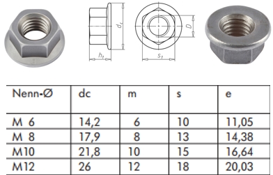 六角法兰螺母,是一种设计有较大受力承载面的螺母,此类螺母与普通螺母的区别在于螺母下面设计了较大的法兰平面且与螺母一体,在装配时不再需要配合使用平垫圈,安装便捷。主要用在管道连接或者需要增加螺母接触面的工件上。标准为DIN6923,对应国标为GB6177。