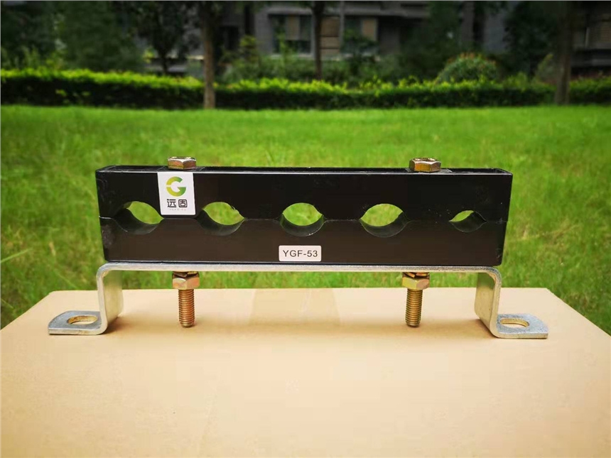 远能公司拥有一批专业的电缆固定夹设计师,他们设计了另一规格的大五孔YGF-53,可同时固定4根185-240平方和1根95-120平方的电缆,用直径表示为4根25-30mm和1根13-18mm的电缆。