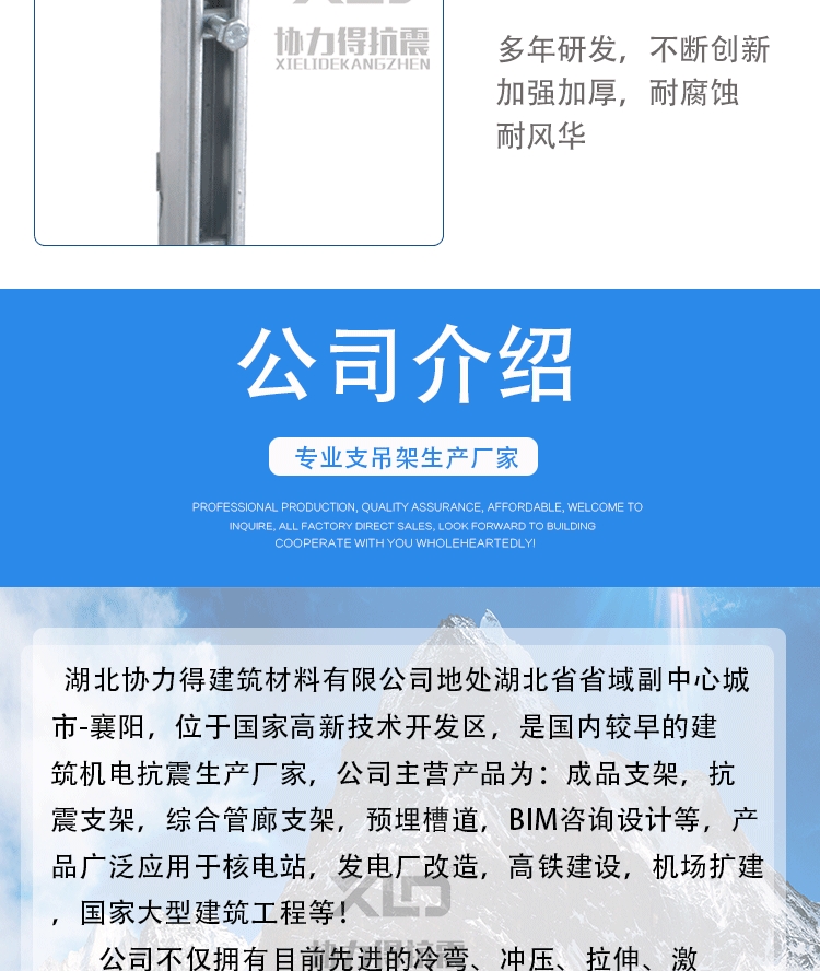 湖北协力得建筑材料有限公司地处湖北省省域副中心城市-襄阳的专业抗震支架厂家,位于国家高新技术开发区的抗震支架品牌,是国内较早的建筑机电抗震支架生产厂家,公司主营产品为:抗震支架 其中包括:风管抗震支架,桥架抗震支架,多管抗震支架,综合管廊支架,预埋槽道,哈芬槽,BIM设计,深化设计等.