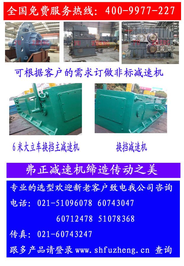 弗正集团现已成为开发生产的减速机产品有:B、X系列摆线针轮减速机;;GR系列斜齿轮减速电机;GS系列斜齿轮蜗轮蜗杆减速电机;GK系列斜齿轮弧齿锥齿轮减速电机;GF系列平行轴斜齿轮减速电机,传递功率小至0.12KW,大至7000KW,输出转矩可达500KNm. 弗正集团现有生产厂房50000多m2,机加工机床和检测仪器500多台套。在3000m2的恒温车间中,装备有50台代表世界先进水平的高效高精密的数控齿轮磨齿机及全自动齿轮检测中心,机床安装调试精度达3级,可确保批量生产齿轮精度达5-6级;装备6台日本进口加工中心及三座标检测中心,可确保大批量生产箱体的尺寸精度、形位精度和加工表面质量。 目前在全国各大、中城市设立了销售和售后服务网点,在方便用户订货的同时也极大地缩短了售后服务的响应时间。并承诺客户我们的售后服务响应时间为24小时。
