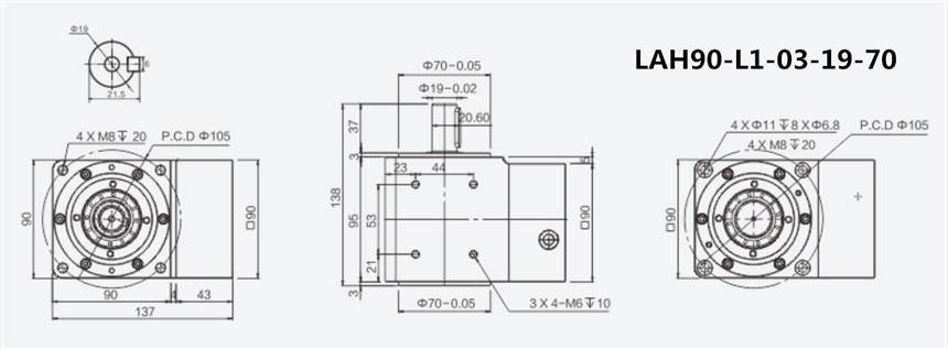 1,安装尺寸:即伺服电机前端的尺寸。在选用直角行星减速机,直角行星减速机的输入端必须与伺服电机的输出端的尺寸完全吻合。