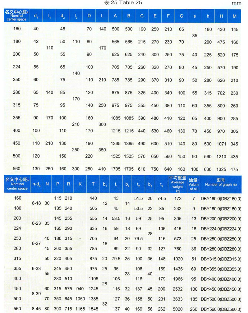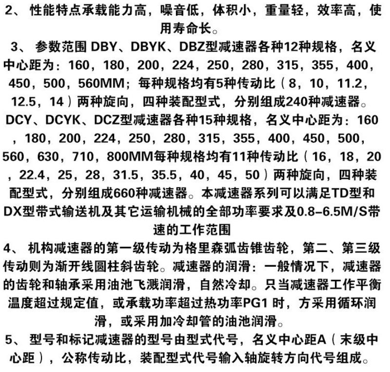 DBY、DBYK、DCZ型减速器各有12种规格,名义中心距为:160、180、200、224、250、280、315、355、400、355、400、450、500、560mm;每种规格均有5种传动比(8、10、11.2、12.5、14),两种旋向,(七)种装配式,分别组成240种减速器。