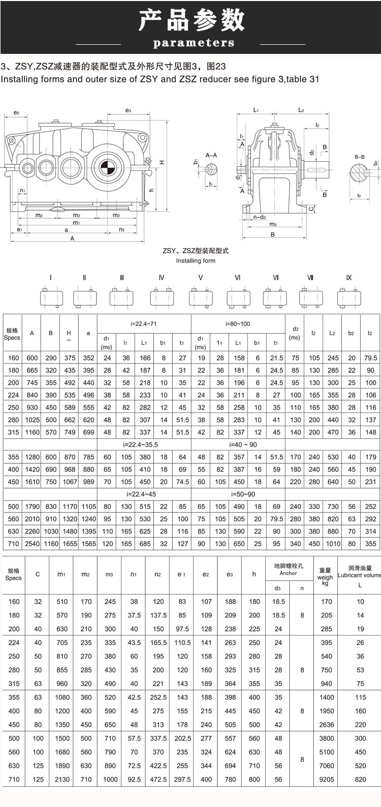 ZSY355-80-IV硬齿面减速机为平行轴结构,箱体为HT200铸件,高刚性带筋,承载扭力大,齿轮齿轴采用合金钢锻件锻造而成,经48小时渗碳,淬火,成型磨齿加工而成,齿面精度和硬度高,啮合好,齿轴各参数均经优化设计,部件互换性强,替代性强。减速机适用于各行各业中,如冶金,煤炭,矿山,水泥,轻工,化工,能源,电厂,船厂,起重,传送,破碎,剪板,工程机械,道路设备等中,使用它的目的是降低转速,增加转矩,适用于高速轴转速不大于1500转/分,齿轮传动圆周速度不大于20米/秒,工作环境温度为-40℃—45℃的环境中。