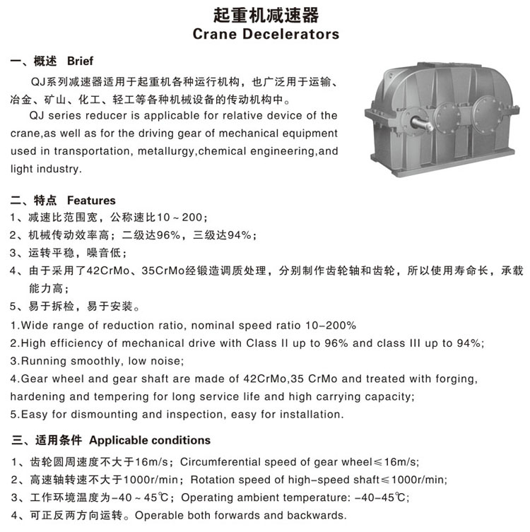 QJRS-D560起重机用中硬齿面齿轮减速机 为三级传送,是在QJR减速机基础上增加了一级,在水平面下方增加一级,增大了传动比,体积变化不大。适用于运输冶金,矿山,化工,钢厂,船厂,煤炭矿山,港口等的起重提升运输设备中,传动效率高,耐冲击。