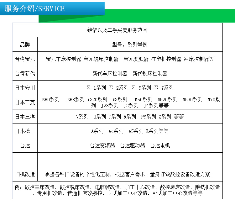 东莞天驰专销售新品二手宝元系统、新品/二手安川伺服、二手台达伺服、二手松下伺服电机、二手三洋伺服、二手三菱伺服、二手台达变频器,以上二手品均可保修三个月,提供维修,数控机床维修、旧机改造等服务,可以为你免费提供技术咨询、故障排除,可提供上门拆机,上门安装调试,上门维修服务。