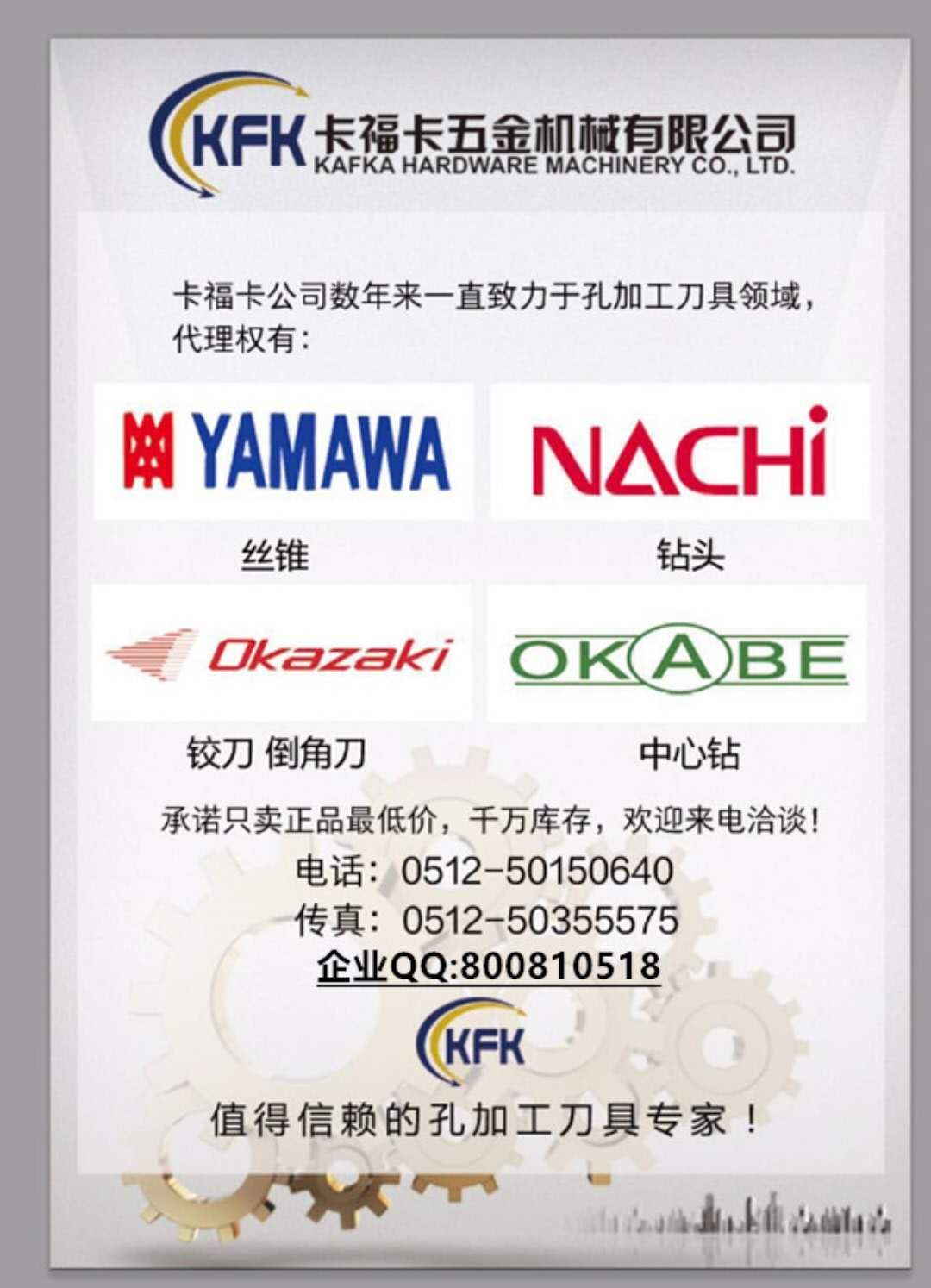昆山卡福卡五金机械有限公司主要代理日本NACHI不二越钻头,YAMAWA丝攻,OKAZAKI(OK)铰刀、OKABE(OK)中心钻,思恩伯格铣刀等,公司以批发和零售畅销消费者市场,在消费者当中享有较高的地位,公司与多家零售商和代理商建立了长期稳定的合作关系。经销的品种齐全、价格合理。公司实力雄厚,重信用、守合同、保证产品质量,以多品种经营特色和薄利多销的原则,赢得了广大客户的信任.