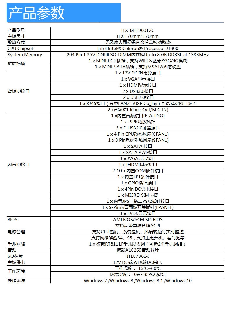 ITX-MJ1900T2C是一款采用MiniITX板型设计的多串口工控板,该主板采用J1900 CPU开发,四核主频最高2.4GHZ,超低功耗,无风扇被动散热,超薄设计,尺寸为17cm*17cm,最高厚度为网卡接口厚度。ITX-MJ1900T2C广告机主板支持2~10个串口COM,GPIO接口,可选2个千兆网卡,多个USB接口,支持HDMI,VGA,LVDS显示接口,支持大屏幕液晶屏点屏。ITX-MJ1900T2C支持MSATA接口,SATA硬盘接口,支持4G模块,WIFI模块。ITX-MJ1900T2C采用工业标准设计,宽温工作范围-10℃~60℃,主板可用于户外广告机,数据采集终端等设备。