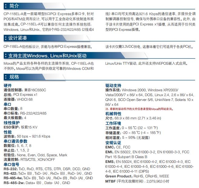 CP-118EL是一款聪明型PCI Express多串口卡,针对POS和ATM应用而设计,可以用于工业自动化制造系统和系统集成。CP-118EL可以兼容任何主流操作系统,它的8个RS-232/422/485串口均可支持高达921.6 Kbps的通信速率,并提供全调制解调器控制信号,确保与外围串口设备的兼容性。此外,由于该卡片使用的是PCI Express x1插槽,从而适用于任何类型的PCI Express插槽.