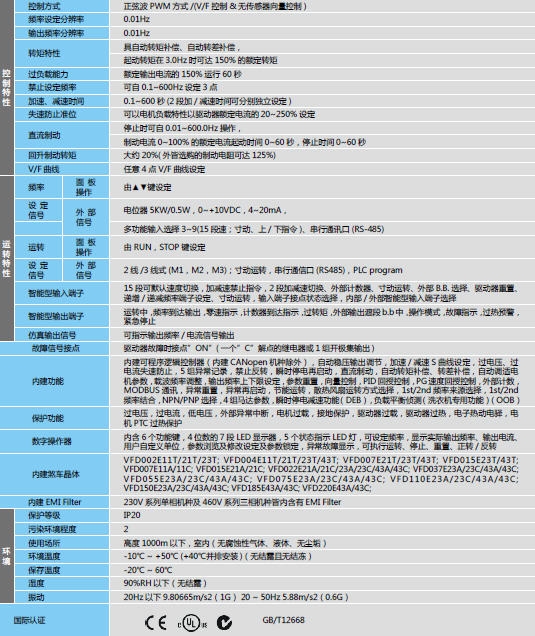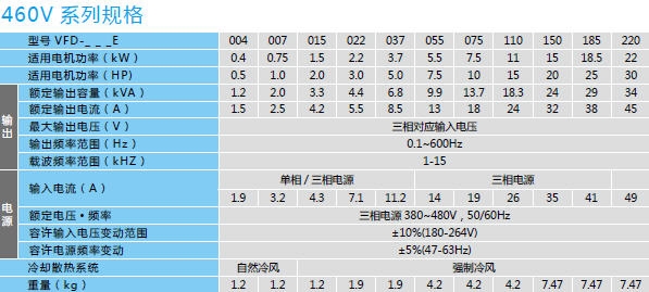 台达变频器VFD015E43A产品规格: