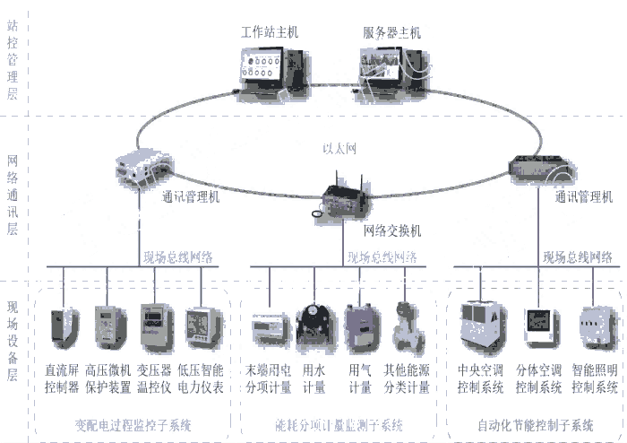 随着经济社会的发展,建筑楼宇、工业企业的能源消耗在其运营成本支出中均占了较大比重,如果企业缺乏科学的能源管理方案,势必牵绊企业的快速发展,建立对该楼宇或企业能源供应和消耗过程的全方位监控体系,对于企业实现开源节流起着关键的作用。变配电所综合自动化监控系统采用三层分布式结构,包括现场设备层、网络通讯层和站控管理层。