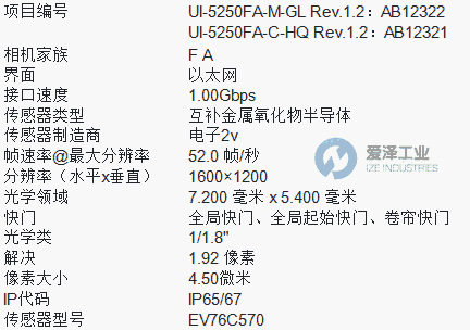 IDS摄像机UI-5250FA-M-GL技术参数及介绍