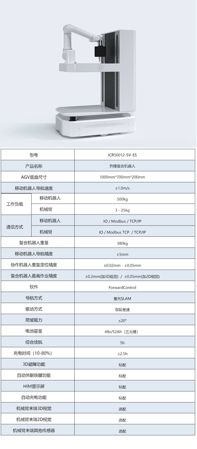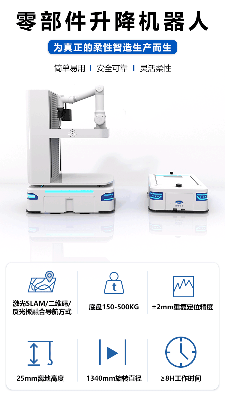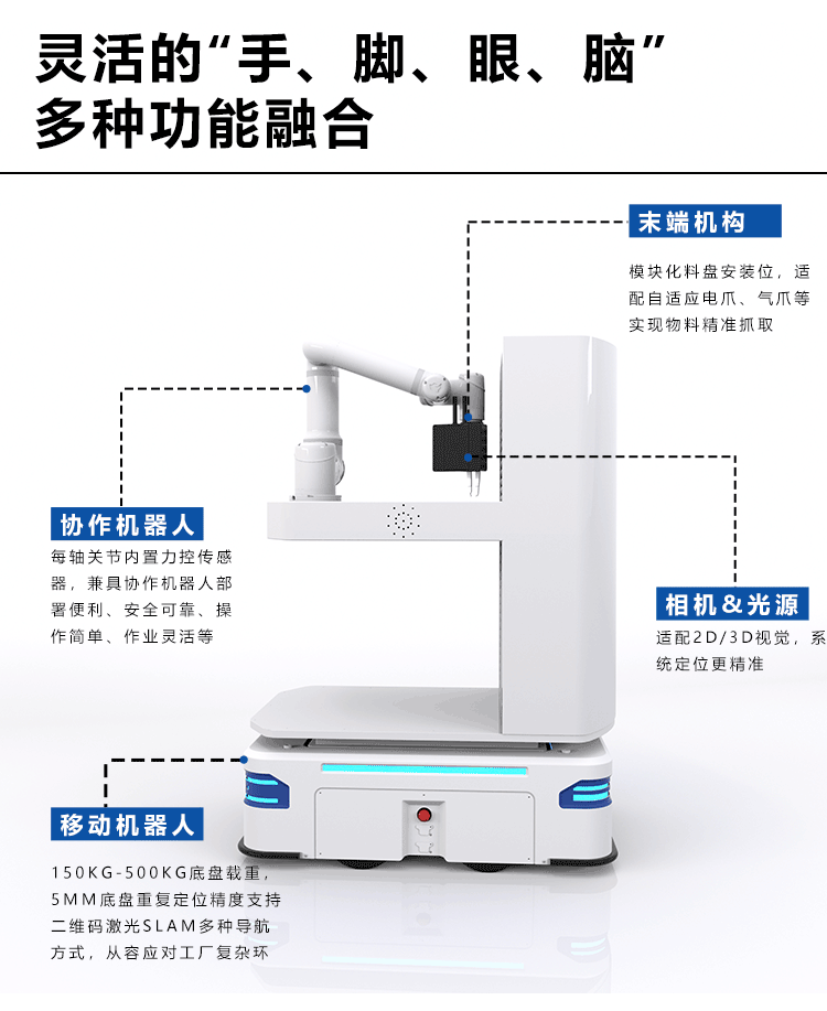 应用场景:复合机器人使得协作机器人有更广阔的作业空间,同时2D/3D视觉系统提供高精度的定位引导,可以实现不同工位物料的自动搬运、分拣、装卸等工作。广泛应用在汽车、电子、新能源、机加工、物流、食品与饮料、生命科学等行业。