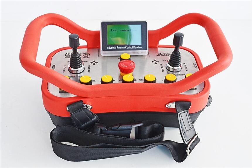 遥控器手持端布局及功能执行:启动 急停,1个四向五速摇杆,1个四方向模拟量比例杆或1个两方向模拟量比例杆,8个选择开关,1号摇杆四方五速摇杆用于控制塔吊的吊钩上下五速以及吊钩前后行走3速,2号比例杆用于控制塔吊吊臂的左旋、右旋模拟量输出控制,模拟量控制输出可调节0-10V、或0-5V,4-20mA。手持端采用箱体式,有背带,可悬挂于胸前操作,手握感良好,可按需定做文字标识或铭牌。开关量摇杆四方向五速,可实现前后左右四个方向动作,每个方向可实现5速控制,每个方向对应5路继电器输出,4个方向可输出开关量20路启动旋钮控制遥控系统整机启动,急停用于发射机和接收机及被控设备的总电源的紧急断开;双摇杆可协同动作,也可独立动作执行,功能多样化,满足多种复杂工业级无线控制需求。