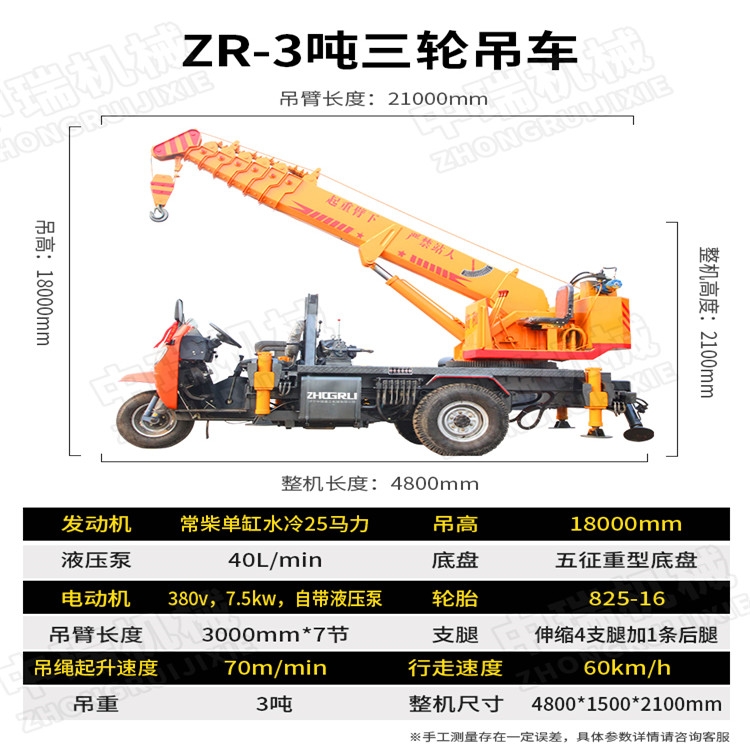 三轮吊车适合地方狭窄使用,可以用于工地、农村改房、园林绿化吊装树木等,速度快,事故少。