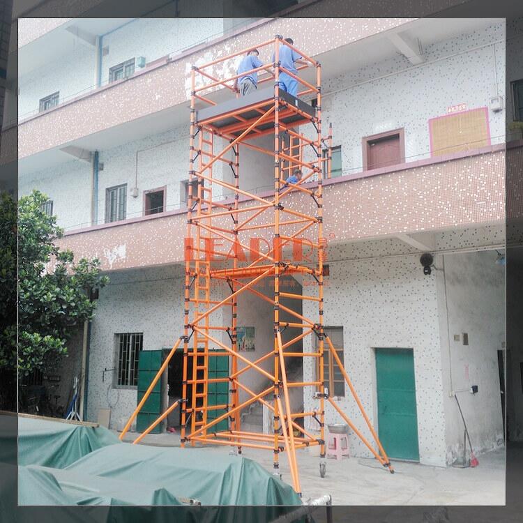 易达(LEADER)移动式玻璃纤维折叠脚手架材质采用由玻璃纤维、玻璃防护垫、无碱纤维、环氧树脂、酚醛树脂、不饱和树脂等三十多种化工材料经高温聚合、拉挤而成的矩形中空结构型材结合销棒工艺制作而成。梯梁型材符合力学结构原理,抗弯性强,不易扭曲变形;梯撑为梯形型材,接触面采用条纹形防滑设计,梯梁、梯撑为半穿透式连接,折叠脚手架采用整根实心圆形玻璃钢棒通体穿连加固,受力均匀合理,整体连接可靠稳固。梯形根据力学原理,采用上窄下宽的八字结构整体梯形(也可根据用户要求定制上下通宽型),美观大方,稳固耐用。
