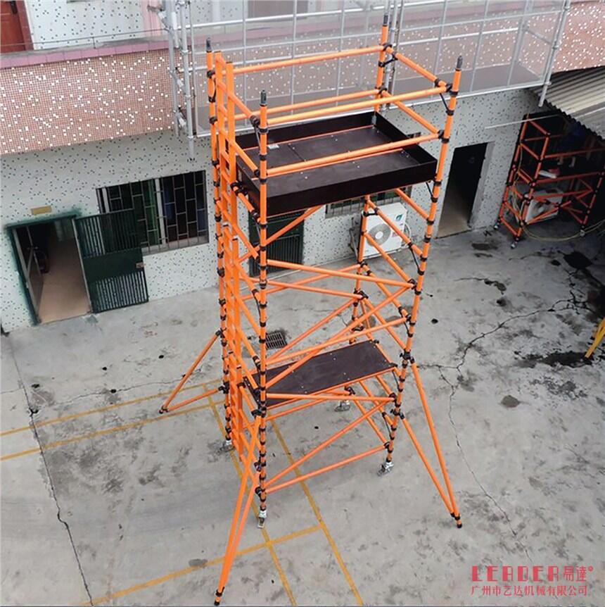 易达(LEADER)移动式玻璃纤维绝缘脚手架施工材质选用轻质高强玻璃纤维管结合而成,整体无金属结构,具有耐腐蚀、抗老化、使用方便、安全程度高、绝缘性能强等特点,
