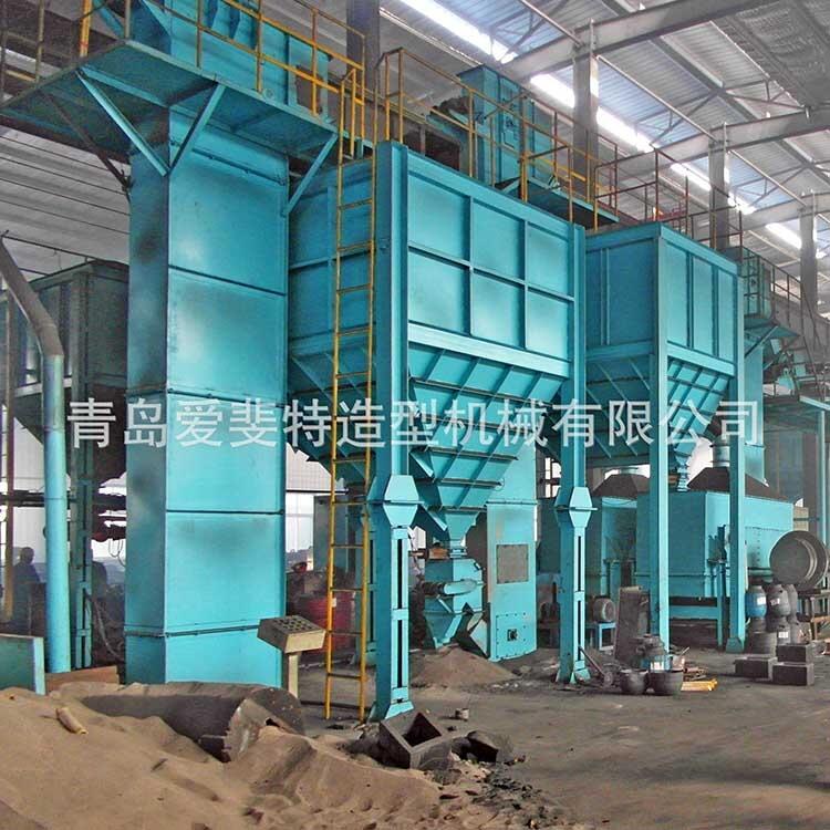 树脂砂生产线主要由落砂机、磁选皮带输送机、悬挂磁选机、振动输送机、破碎机、再生机、风选机、砂温控制器、气力输送装置、树脂砂混砂机、斗式提升机、砂库、脉冲式反吹除尘器、全套电控、气控系统、其他钢结构组成。