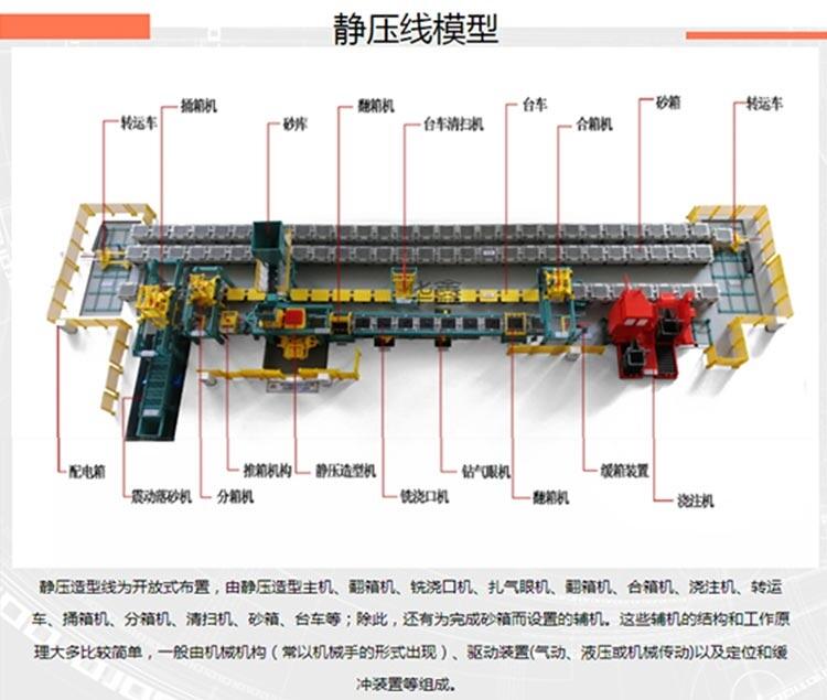 全线有30多台套机械、电控、液压设备及砂箱、小车组成。其中包含落砂、分箱、箱面及内腔清扫、造型、翻转、铣浇口、扎气眼、合箱、紧箱钩、铸型冷却等诸工序。造型线分为落砂、造型、下芯、浇注、冷却五个区段。并且,其设有手动、单机自动、自动、不造型、不加砂、不落砂、不吹气、吹气填砂+吹气予紧实、冷却道选择等多种工作制度。