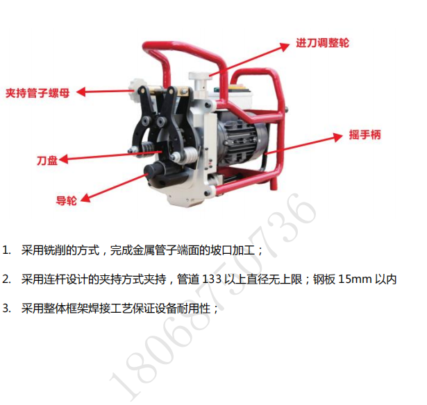 适用范围 | 加工管道最小直径为114MM,最大无上限;斜边最大15MM,同时还可以加工最大厚度15MM的板材。 | ||