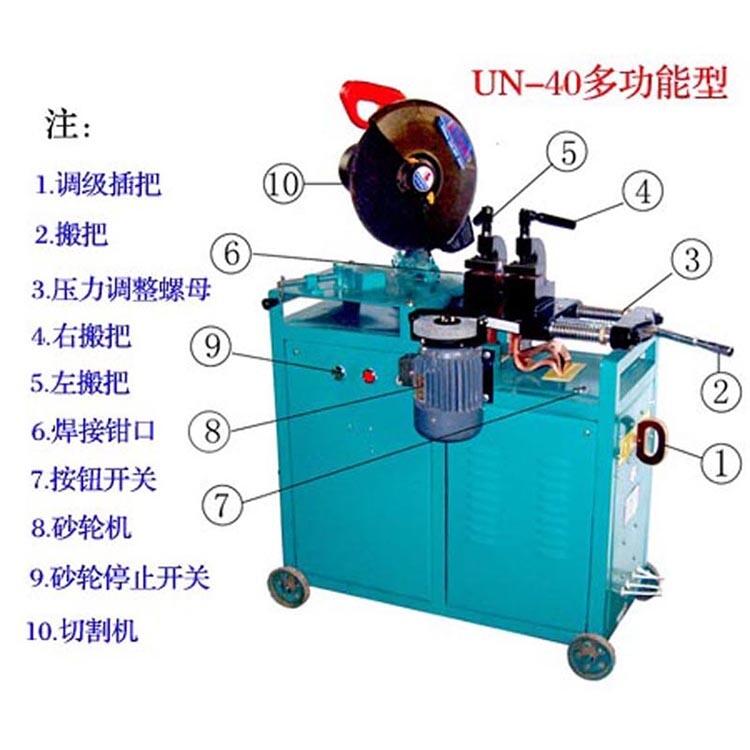 UN-40型多功能对焊机,是为焊接高碳钢材的客户特意设计制作。具有焊接、切割、回火、清除焊接毛刺等功能,属于多功能一体式对焊机。其结构主要由单相全铜焊接变压器、丝杠式焊接夹具、切割机、砂轮机以及其他电器配置等所组成。使用方便、使用时间长久等优点。