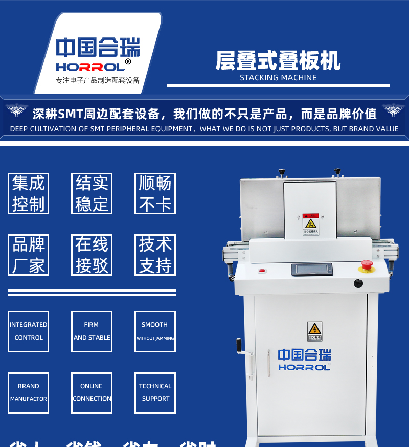 层叠式叠板机接是SMT生产线配备的周边设备一种。它可以单独连接两台设备,也可以分段或成组使用,它可以处理技术参数中所指定规格的PCB板。它的送板动作受后续设备的需板信号的控制,若叠板机已全部送完板则它又会反制约后续设备停止工作,并发出声光报警,此设备用于SMT生产线上光板的上板操作。广泛用于生产线上之PCB板传输、检查、测试,缓冲接驳等功能。它是连接和缓冲两台设备之间的主要设备之一。