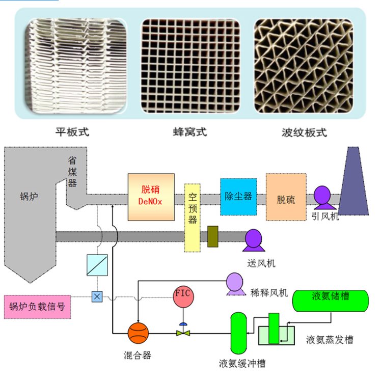 锅炉或窑炉的出口烟气(有的经过脱硫塔、除尘器之后)通过SCR进口烟道与氨喷射格栅(AIG)注入的氨气经过充分混合后,进入反应器。在催化剂的作用下,NOx与NH3进行氧化还原反应,最终生成N2和H2O。