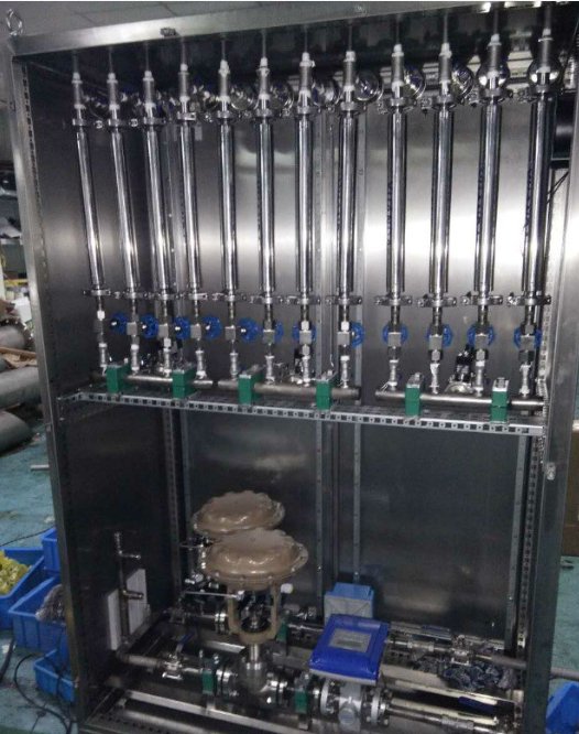 五、在线稀释计量分配模块: 一台炉一套计量混合模块,所有仪器仪表集中布置,布置在计量混合模块柜内。每台炉所需的稀释水在与氨水混合前由流量计控 制,电动调节阀调节。每个喷射点均由流量计控制,确保分配均匀。还原剂混合液的压力由压力表监控,计量混合模块布置在喷射区附 近。20的氨水与稀释水混合稀释到需要的浓度方可喷射入炉膛,设有稀释水箱(储存除盐水或者工业用水)、稀释水泵混合器,计量分配系统设有转子流量计,配有双开门柜。