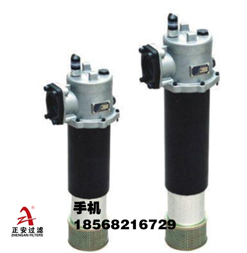 过滤器配有发讯器,旁通阀和集污盅。具有通油能力大,阻力小等优点。其主要 性能特点有: 1.过滤器直接安装在油箱盖板上,筒体伸入油箱的油液中。出油口设有螺纹和法兰 两种连接方式,与油泵吸油口连接,管路简单,安装方便。