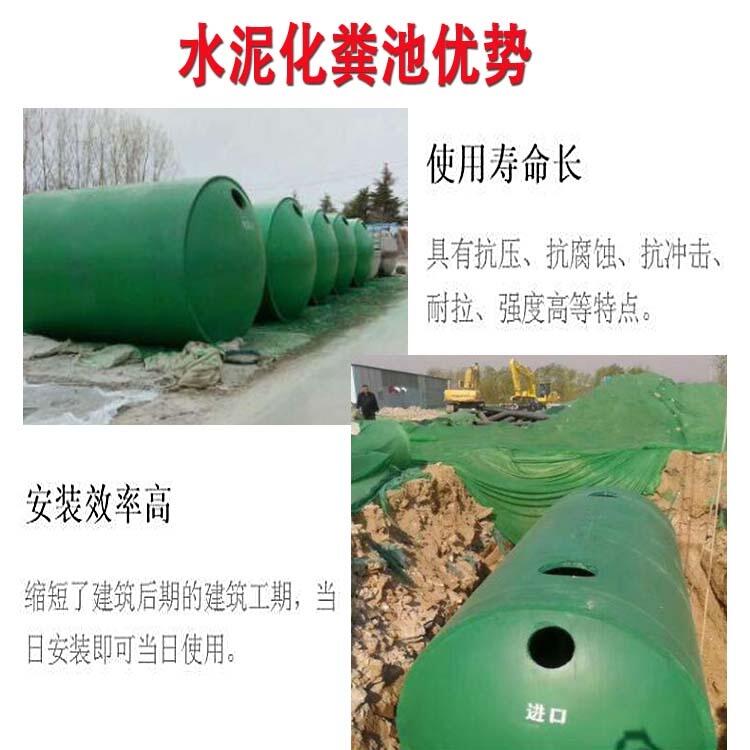 新型预制钢筋混凝土组合式化粪池,是取代传统砌筑及现代浇注化粪池的一种新品种。它的优点如下: 1. 经济指标低。现场组装经济指标低于砼现浇化粪池30%左右,低于传统砖砌化粪池10%左右。 2. 安装快捷方便。只需3-4小时,施工费用低,当天安装即可使用。 3.绿色环保,无地下水污染。多次净化污水,循环无死角,污水处理程度高于国家标准。 4.经久耐用 。不老化,不变形,不渗漏,抗酸碱,使用寿命长达100年以上。 5.抗压强度高。经试验标准型承载25吨货车,增强型承载50吨货车无异常。 6.无需专人管理,清渣周期长。一般情况下五到八年清掏一次,减少了清理费用。 7.处理效果好 。污水处理效果十分稳定,,净化后的水质符合国家污水综合排放标准。 8.占地面积小 。为传统化粪池的50%左右