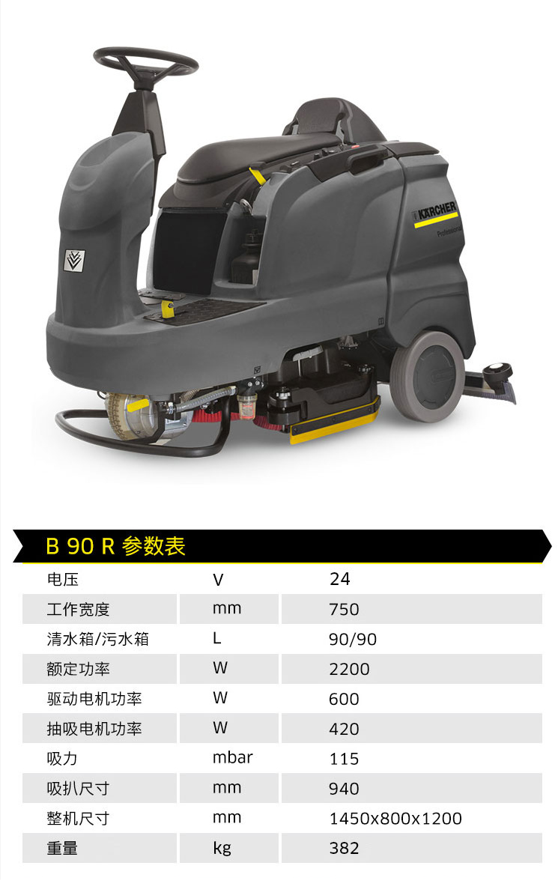 卡赫驾驶式洗地机B 90 R Classic Bp是大型手推式机器的替代选择,可操控性强!B 90 R Classic Bp驾驶式洗地吸干机配备了新一代刷头。多种工作宽度 (55-75 cm)的滚刷头和盘刷头可供选择。刷子由星轮装置驱动。机器的转向半径仅为1.6 m,非常灵活,提供卓越的操控性。这款机器的清水箱容量还可以加大,灌注清水也很方便。紧凑的外形,易于存储和运输,例如进入电梯等地方。电池舱的通风口确保在长时间使用中能够通风充分。附加的扁平多褶过滤器能防止涡轮机腐蚀。
