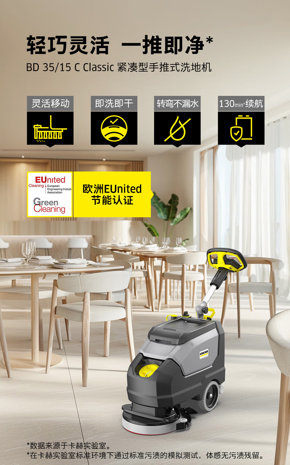 卡赫BD 35/15C是一款机身紧凑灵活,可以在拥挤环境或放满桌椅的场景内穿梭清洁,十分适合小空间和拥挤空间内的清洁需求。独特的半包围随动吸扒,可以实现大幅度转弯不漏水,速干不留痕的效果。采用多维立体式出水结构,获得欧洲EUnited权威认证,绿色环保真节水。同时作为一款入门级洗地机,它可靠耐用,性价比高。使用轻便易控,对清洁人员十分友好。非常适合应用在餐饮门店、健身房、小型商超、办公室、实验室、拥挤车间等场景。