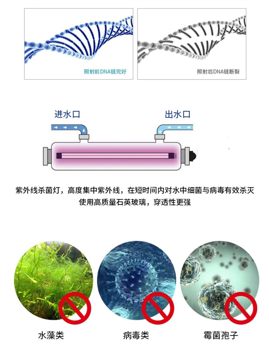 紫外线杀菌器的杀菌原理是利用紫外线光子的能量破环水体中各种病毒、细菌以及其它致病体的DNA结构。主要是使DNA中的各种结构键断裂或发生光化学聚合反应,例如使DNA中THYMINE二聚,从而使各种病毒、细菌以及其它致病体丧失复制繁殖能力,达到灭菌的效果。具有高效率、广谱性、低成本、长寿命、大水量和无二次污染的特点。