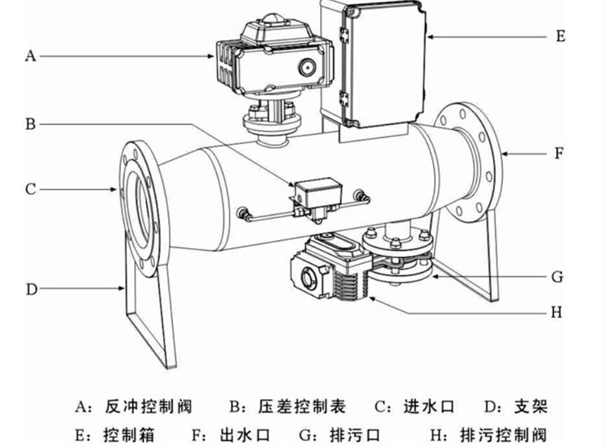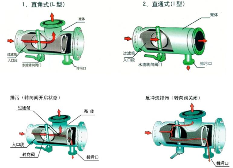 自动反冲洗过滤器自动清洗在预设压差或反冲间隔时间到达时排污阀自动打开,反冲程序开始。在电机驱动下反冲吸口沿细滤网表面螺旋转动。滤网表面积聚的颗粒杂质经由反冲进入吸口,然后经排污阀流出。反冲持续时间约 40 秒到 1 分钟。