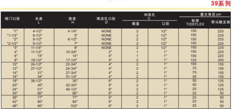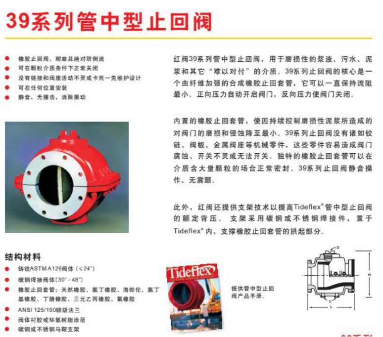 美国红阀39系列管中型止回阀,红阀39系列管中型止回阀,用于磨损性的泥浆、污水、泥浆和其它难以对付的介质。39系列止回阀核心是一个由纤维加强的合成橡胶止回套管,它可以一直保持流阻小。正向压力自动开启阀门,反向压力使得阀门关闭。结构材料:铸铁或者碳钢焊接阀体;橡胶止回套管采用氯丁橡胶、海帕伦、丁晴橡胶、三元乙丙橡胶、氟橡胶及丁苯橡胶;碳钢或不锈钢马鞍支架。※CheckMate管中型止回阀,止回阀为全橡胶结构,为流体驱动止回型式,内嵌式套接接口.整个止回阀应有纤维加强层遍布整个阀体、止回套和安装接口,阀体和止回套之间由加强纤维和橡胶连接,并被硫化成一体式整体结构。阀瓣密封处需带有弓形缺口,阀体内需有不锈钢丝整体加强。