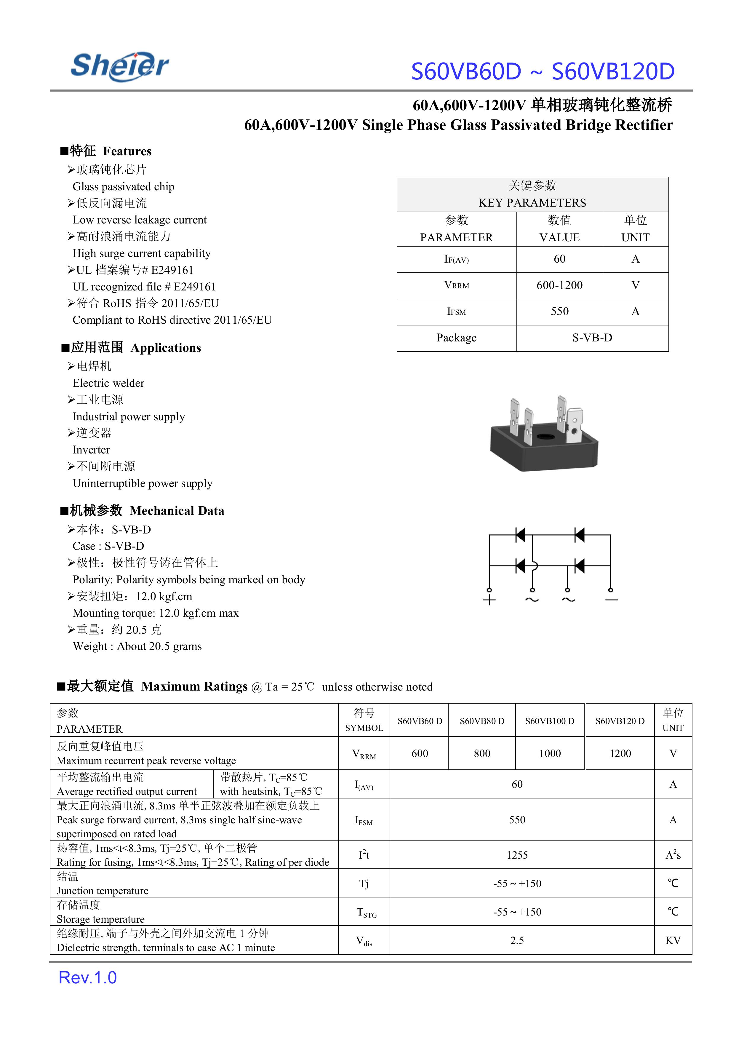 sheier/乐山希尔 S60VB120D/S60VB100D/S60VB80D/S60VB60D 全新原厂原装高压大电流分立式功率整流器件整流桥,1200V~600V、60A、片式端子方形桥堆:S60VB120D/S60VB100D/S60VB80D/S60VB60D。正向整流电流:60A;反向峰值电压:1200V~600V;;正向压降VF:1.2V;封装方式:ST-S针脚式;最小包装数量:100pcs/盒。