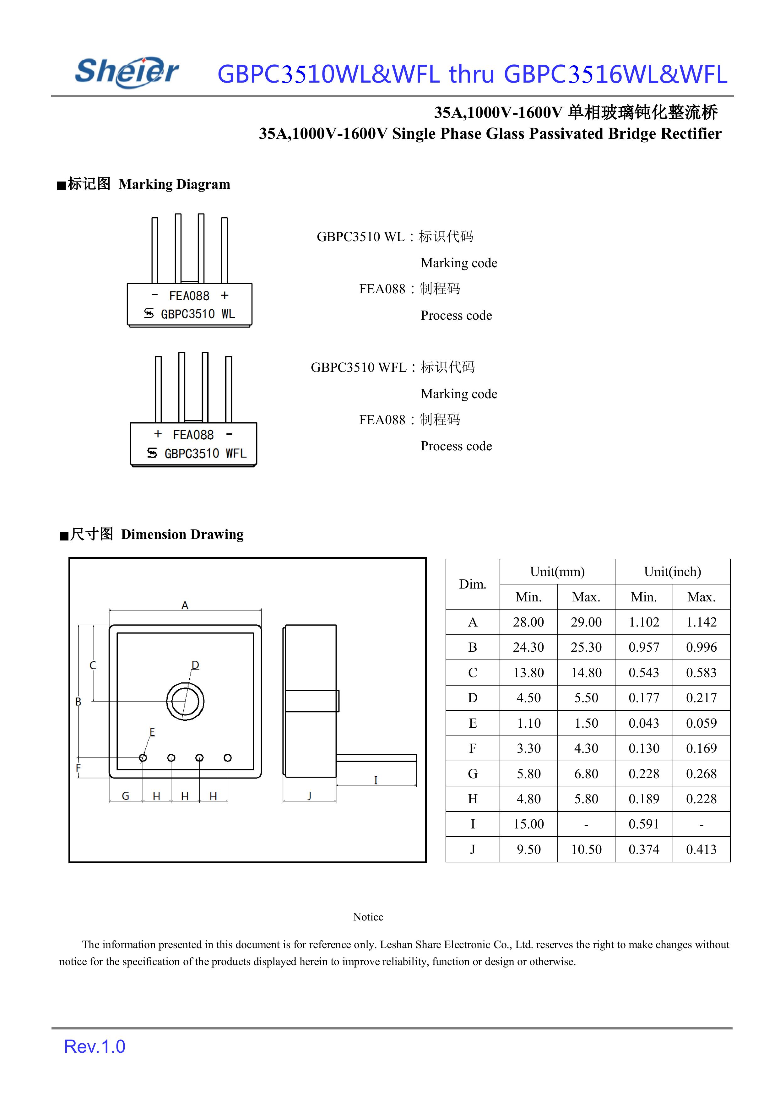 sheier/乐山希尔 GBPC3516WL/GBPC3512WL/GBPC3510WL 全新原厂原装高压大电流分立式功率整流器件整流桥,1600V~600V、35A、单排针脚式方形桥堆:GBPC3516WL/GBPC3512WL/GBPC3510WL。正向整流电流:35A;反向峰值电压:1600V~600V;;正向压降VF:1.1V;封装方式:GBPC-WL&WFL针脚式;最小包装数量:100pcs/盒。